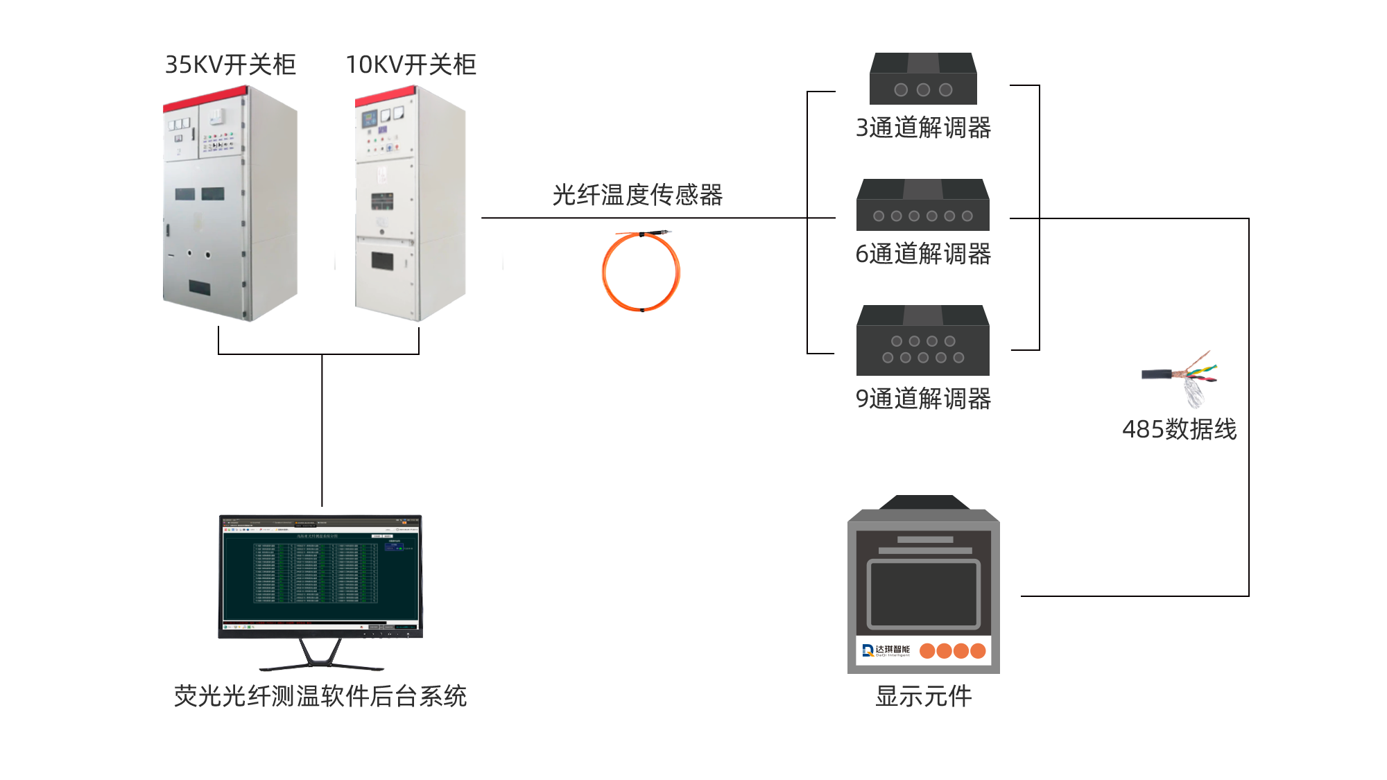 采用熒光光纖在線監(jiān)測(cè)技術(shù),對(duì)站區(qū)內(nèi)的高壓開關(guān)柜的斷路器靜觸頭、母線排接頭、電纜接頭等部位進(jìn)行溫度監(jiān)測(cè)。熒光光纖溫度傳感器探頭可直接緊貼觸點(diǎn)或接點(diǎn)表面進(jìn)行準(zhǔn)確的溫度監(jiān)測(cè),且不會(huì)改變柜體原有的電氣絕緣性能。實(shí)現(xiàn)在本地和遠(yuǎn)程實(shí)時(shí)監(jiān)測(cè)開關(guān)柜內(nèi)各熱點(diǎn)溫度變化情況,實(shí)時(shí)發(fā)出報(bào)警信息。查看實(shí)時(shí)、歷史溫度曲線,分析溫升變化。