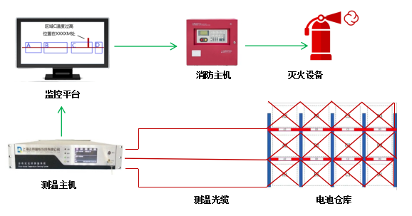 基于分布式光纖測溫的鋰電池倉儲溫度監(jiān)測系統(tǒng),對鋰電池自動化倉庫實時在線溫度監(jiān)測,全面的掌握每個貨位的溫度變化,當某個貨位或多個貨位出現(xiàn)溫度異常時,系統(tǒng)可迅速發(fā)出警報,精準定位發(fā)熱點位置。同時系統(tǒng)可聯(lián)動消防報警主機從而控制其他消防設備,可有效降低火災及爆炸事件的發(fā)生,確保電池倉庫的安全和人們生命財產(chǎn)安全。